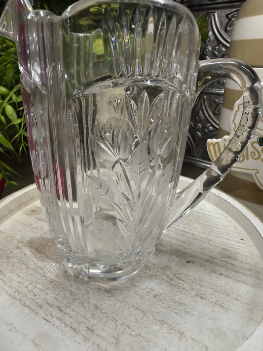 Vintage Glass Pitcher Poland 24% Lead Crystal with Flower Etched Motif